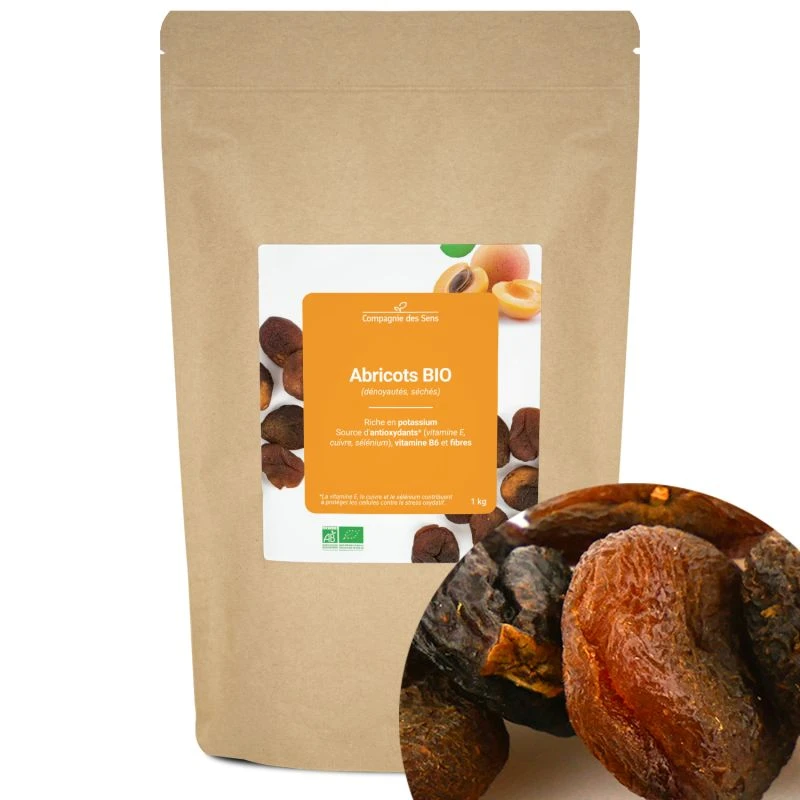 Ces Abricots dénoyautés et séchés sont certifiés BIO par Ecocert (FR-BIO-01). Ils sont riches en potassium et sources d’antioxydants (vitamine E, cuivre, sélénium), vitamine B6 et fibres. Moelleux et naturellement sucrés et fruités, ils peuvent être consommés tels quels ou en morceaux, tout au long de la journée, seuls ou mélangés avec d’autres fruits secs, dans des préparations sucrées (desserts, laitages, mueslis…) ou salées. Ces Abricots sont vendus dans un sachet hermétique pour préserver tous leurs bienfaits et les utiliser facilement au quotidien.