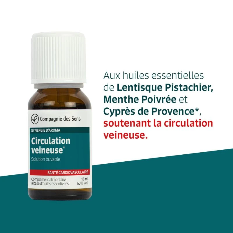 Solution buvable aux huiles essentielles de Lentisque Pistachier, Menthe Poivrée et Cyprès de Provence, soutenant la circulation veineuse.