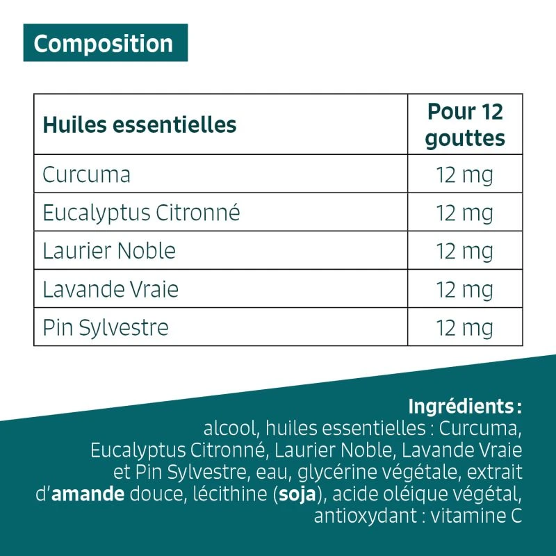 Solution buvable aux huiles essentielles d’Eucalyptus Citronné, Lavande Vraie, Pin Sylvestre, Curcuma et Laurier Noble, contribuant à apaiser les douleurs articulaires ponctuelles.