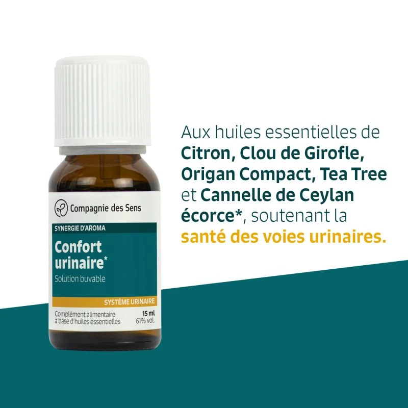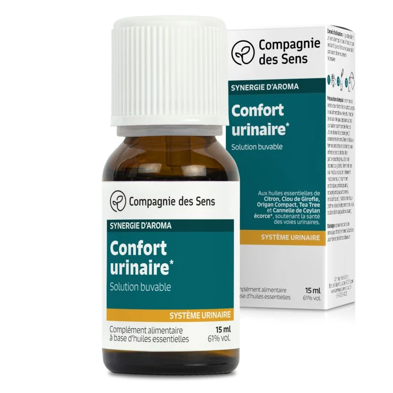 Solution buvable aux huiles essentielles de Citron, Clou de Girofle, Origan Compact, Tea Tree et Cannelle de Ceylan écorce, soutenant la santé des voies urinaires.