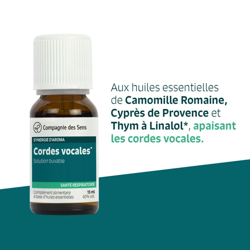 Solution buvable aux huiles essentielles de Camomille Romaine, Cyprès de Provence et Thym à Linalol, apaisant les cordes vocales.
