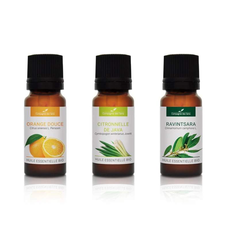 Les 3 huiles essentielles BIO sont emballées dans un petit pochon en coton non traité et réutilisable.
