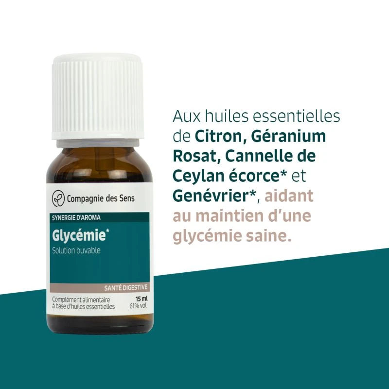 Solution buvable aux huiles essentielles de Citron, Géranium Rosat, Cannelle de Ceylan écorce et Genévrier, aidant au maintien d’une glycémie saine.
