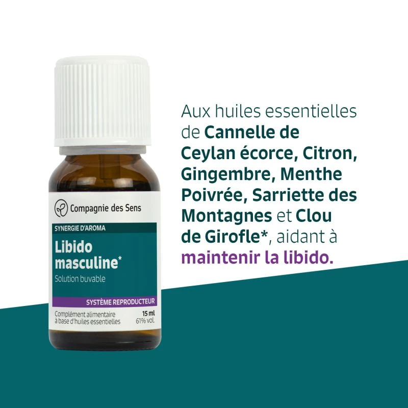Solution buvable aux huiles essentielles de Cannelle de Ceylan écorce, Citron, Gingembre, Menthe Poivrée, Sarriette des Montagnes et Clou de Girofle, aidant à maintenir la libido.