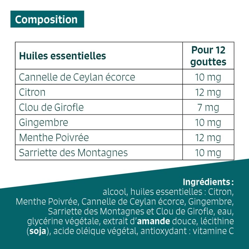| Ingrédients : | Alcool (61%), huiles essentielles : Citron, Menthe Poivrée, Cannelle de Ceylan écorce, Gingembre, Sarriette des Montagnes et Girofle, eau, glycérine végétale, extrait d’amande douce, lécithine (soja), acide oléique végétal, antioxydant : vitamine C |