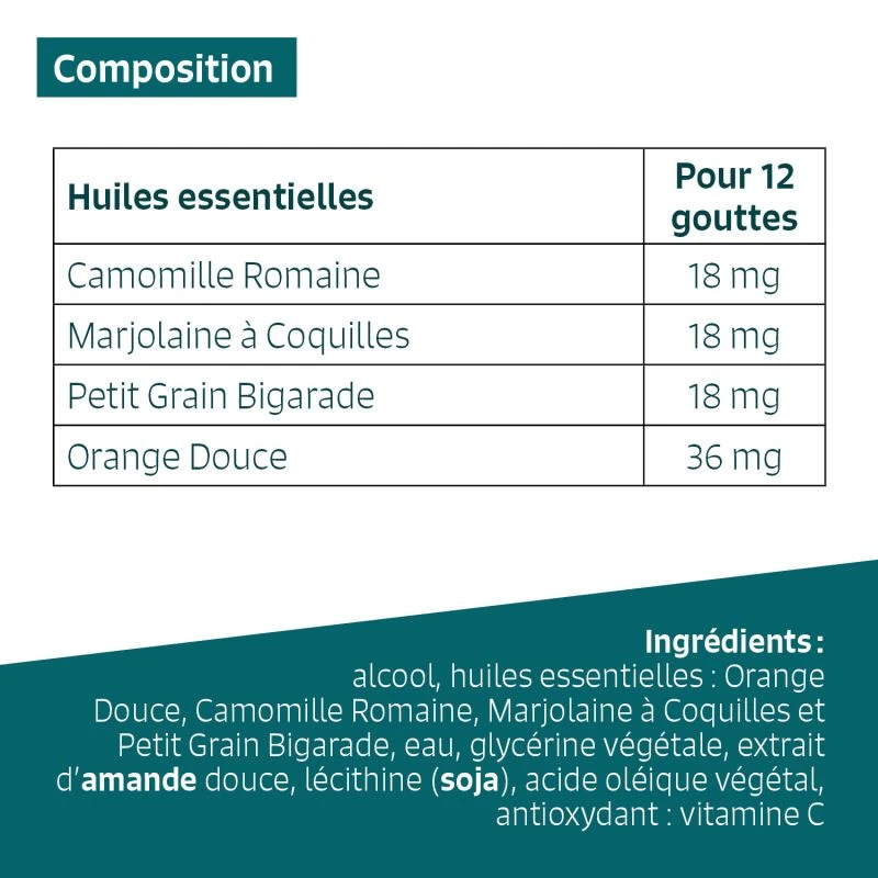 Solution buvable aux huiles essentielles de Camomille Romaine, Marjolaine à Coquilles, Orange Douce et Petit Grain Bigarade, favorisant la détente et contribuant à diminuer la nervosité.