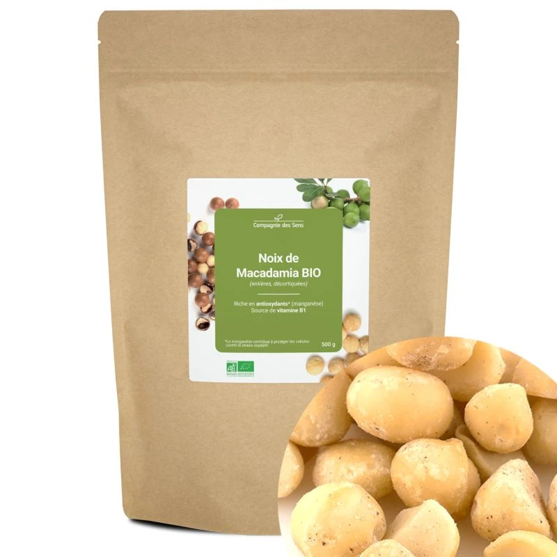 Ces Noix de Macadamia décortiquées sont certifiées BIO par Ecocert (FR-BIO-01). De qualité premium, ces noix sont entières ! Elles sont riches en antioxydants (manganèse) et graisses insaturées, mais également sources de vitamine B1. Elles peuvent être consommées telles quelles, grillées ou concassées. Il est également possible de les consommer seules ou mélangées à d’autres fruits secs, dans des préparations sucrées ou salées. Ces Noix de Macadamia sont vendues dans un sachet hermétique pour préserver tous leurs bienfaits et les utiliser facilement au quotidien.
