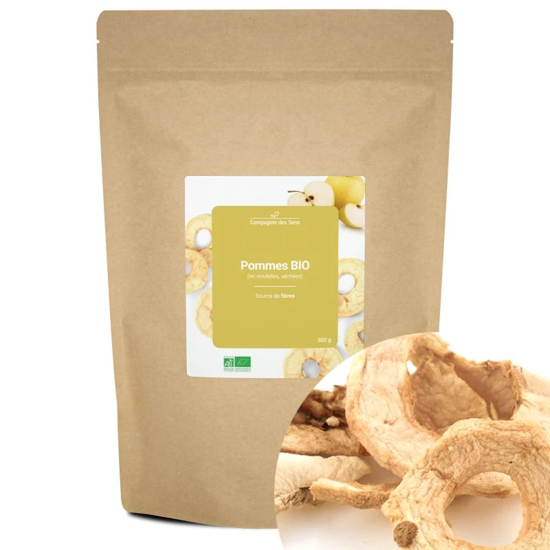 Ces Pommes en rondelles séchées sont certifiées BIO par Ecocert (FR-BIO-01). Source de fibres et sans matières graisses, elles peuvent être consommées telles quelles, mélangées à d’autres fruits secs, dans des préparations sucrées et à tout moment de la journée. Ces Pommes sont vendues dans un sachet hermétique pour préserver tous leurs bienfaits et les utiliser facilement au quotidien.