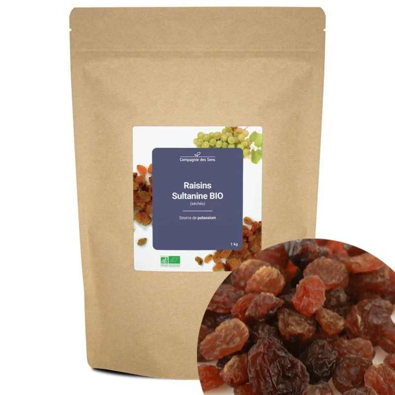 Ces Raisins Sultanine séchés sont certifiés BIO par Ecocert (FR-BIO-01). Source de potassium, ils peuvent être consommés natures en en-cas ou mélangés avec d’autres fruits secs, dans des desserts, mueslis, laitages ou encore dans des préparations aussi bien sucrées que salées. Ces Raisins Sultanine sont vendus dans un sachet hermétique pour préserver tous leurs bienfaits et les utiliser facilement au quotidien.